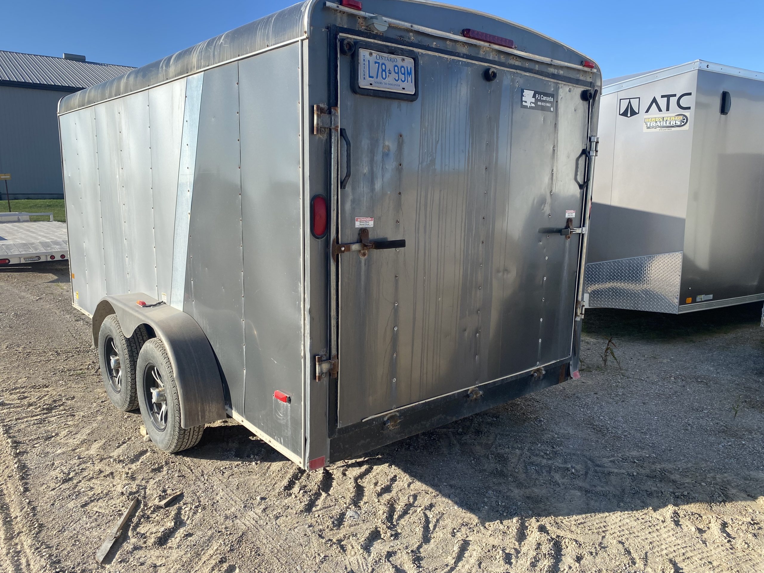 7’x14′6.5′ tallTandem leaf spring axelsAluminum rimsRamp doorSide entrance door Spare tire Plywood floor